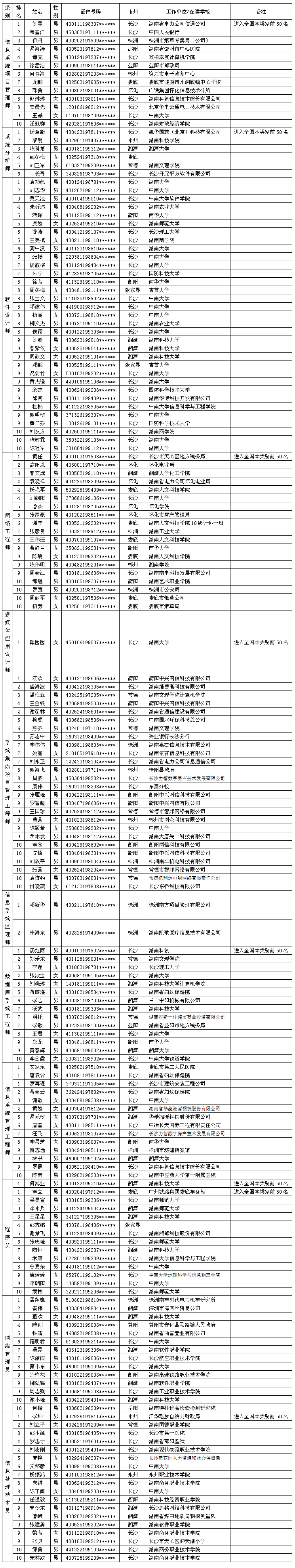 2013年上半年全国计算机技术与软件专业技术资格(水平)考试已圆满结束,湖南省各级别报考人员取得优异成绩,现将全省各级别前10名的合格人员名单公布如下。