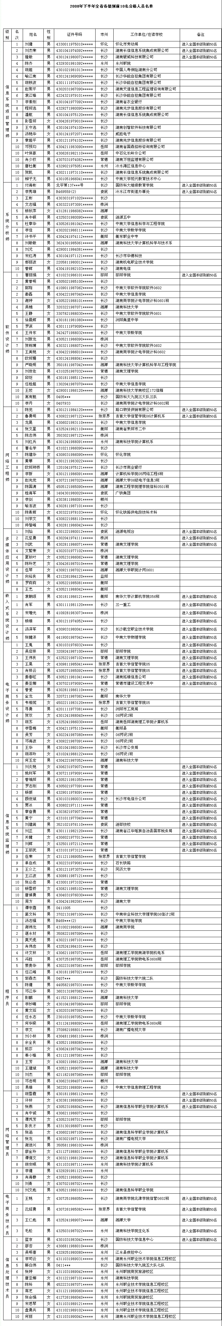 2008年下半年全国计算机技术与软件专业技术资格(水平)考试已圆满结束,湖南省各级别报考人员取得优异成绩。现将全省各级别前10名的合格人员名单公布如下。