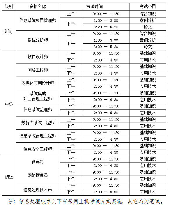 考试级别分5个专业:计算机软件、计算机网络、计算机应用技术、信息系统、信息服务。每个专业又分三个层次:高级资格(高级工程师)、中级资格(工程师)、初级资格(助理工程师、技术员)。对每个专业、每个层次,还设置了若干个级别。考生可根据自己的水平以及熟悉的专业情况选择适当的级别报考。
