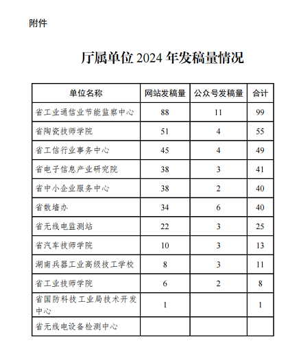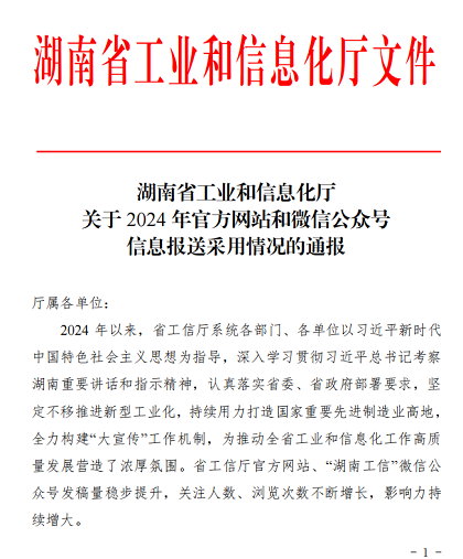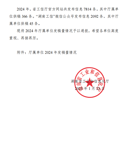 2024年,省工业通信业节能监察中心信息报送工作再创佳绩。全年,在厅网站、“湖南工信”微信公众号发稿量均在厅属单位排名第一。