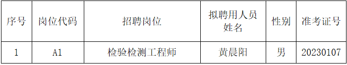 根据《湖南省电子信息产业研究院2023年公开招聘公告》及有关规定,经报名、资格审查、笔试、面试、体检、考察和递补等程序,经院党委研究,确定A1岗位递补人员黄晨阳同志为湖南省电子信息产业研究院2023年度公开招聘A1岗位(检验检测工程师)拟聘用人员,现予以公示。