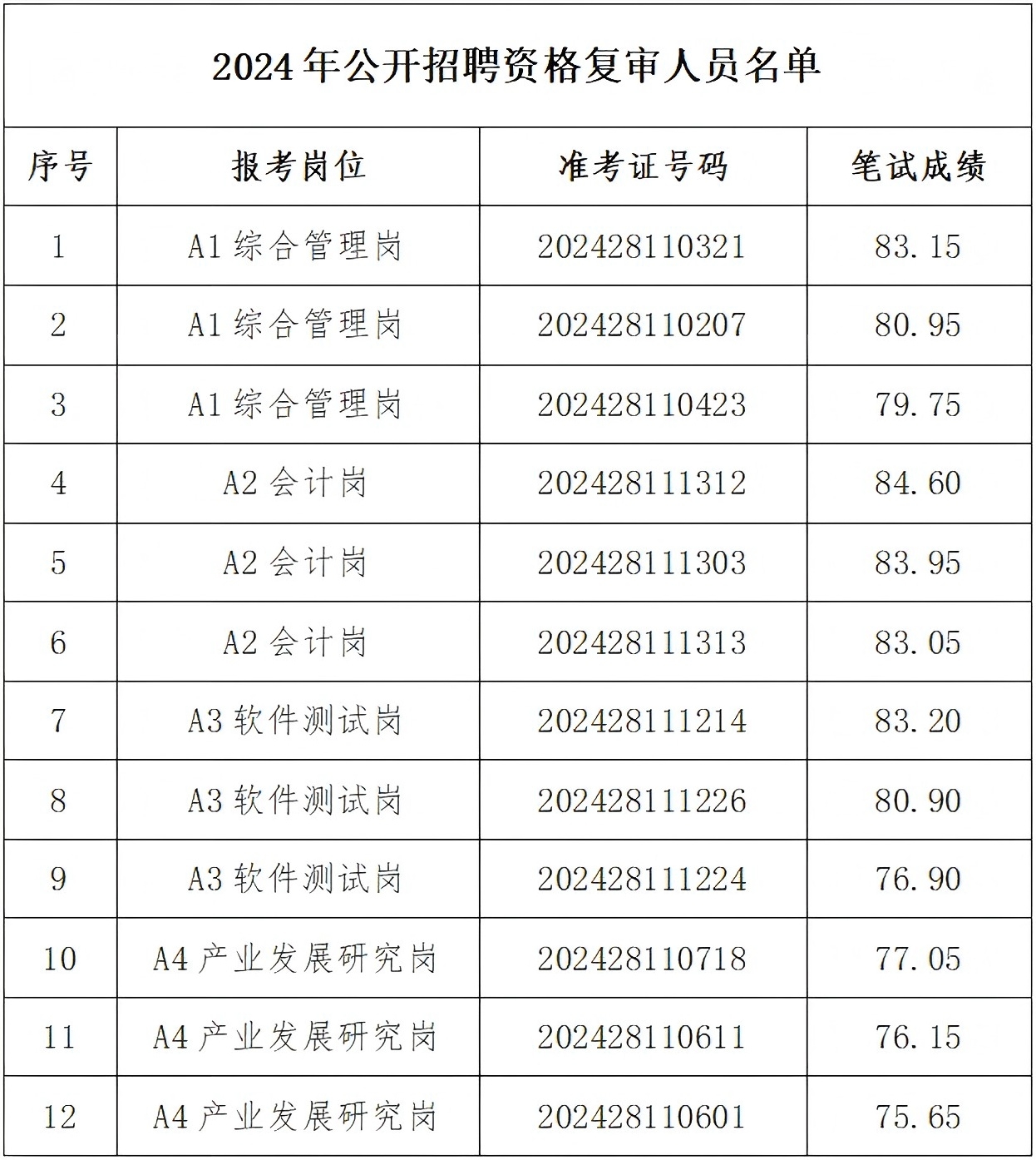 资格复审对象根据《公告》中规定的比例按笔试成绩从高到低的顺序确定,人员名单如下: