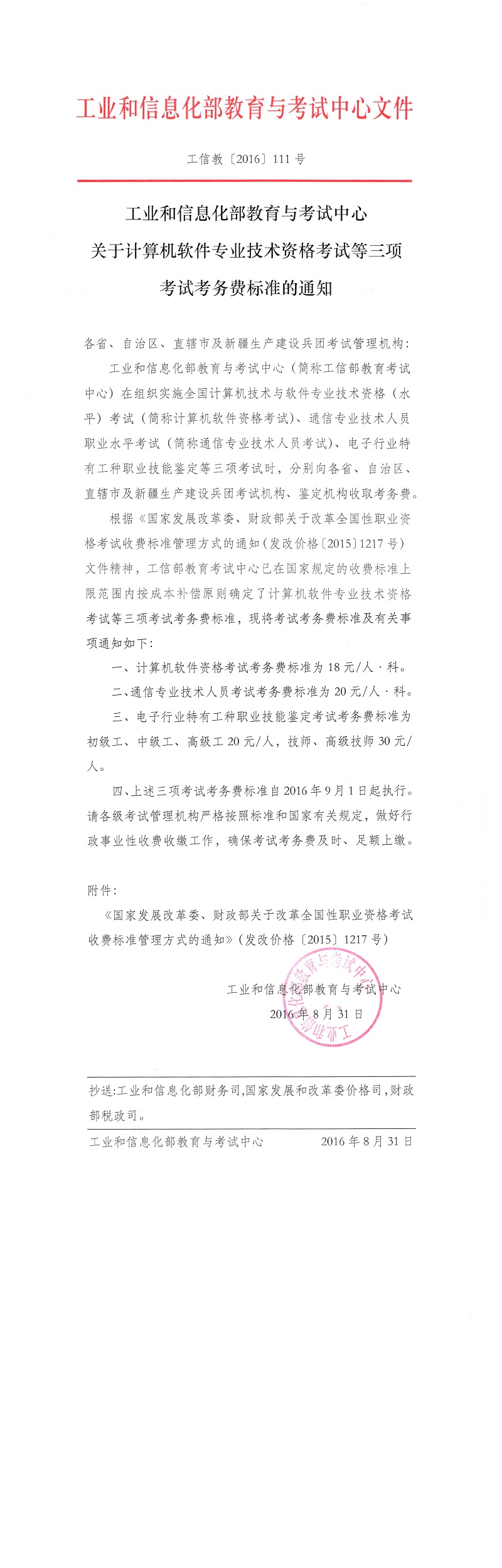 工业和信息化部教育与考试中心关于计算机软件专业技术资格考试等三项考试考务费标准的通知
