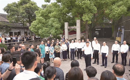 7月5日至7日,中共中央总书记、国家主席、中央军委主席习近平在江苏考察。这是6日上午,习近平在苏州平江历史文化街区,同当地居民和游客亲切交流。新华社 发