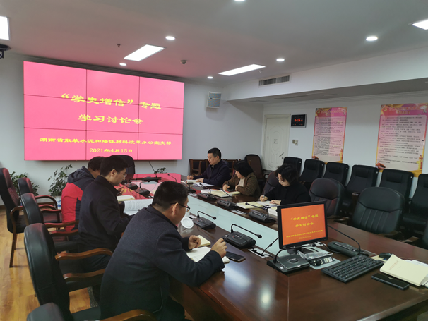 4月15日下午,省散墙办主任廖晓武组织全体党员干部开展“学史增信”专题集中学习讨论,大家一起学习了毛泽东《在中国共产党第七届中央委员会第二次全体会议上的报告》摘编、习近平《关于坚持和发展中国特色社会主义的几个问题》、《在全国脱贫攻坚总结表彰大会上的讲话》等经典篇章。在讨论中,廖晓武指出,学史增信根本是要进一步坚定对以习近平同志为核心的党中央的信赖,要通过学党史,不断增强中国特色社会主义道路自信、理论自信、制度自信、文化自信,进一步坚定对马克思主义的信仰,对中国特色社会主义的信念,进一步增强“四个意识”、做到“两个维护”,自觉在思想上政治上行动上同以习近平同志为核心的党中央保持高度一致,把党的光荣传统和优良作风转化为不可撼动的理想信念,转化为干事创业的必胜信心,牢记习近平总书记殷殷嘱托,牢牢把握新发展阶段、新发展理念、新发展格局的实践要求,深入贯彻“三高四新”战略,推动我省散装水泥和新型墙体材料高质量发展。