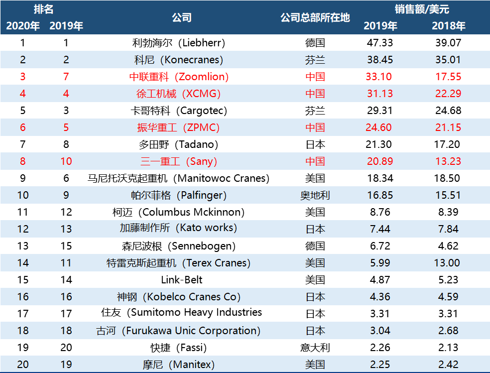 近日,英国KHL集团发布了2020年度的全球起重机械制造商20强排行榜《ICM20》。榜单显示,中联重科、三一集团的起重机械销售额分别位列全球第三、第八,且排位分别比2019年前进了4位、2位。起重机械领域的强大实力,正是装备“湘军”近年不断崛起的一个佐证。