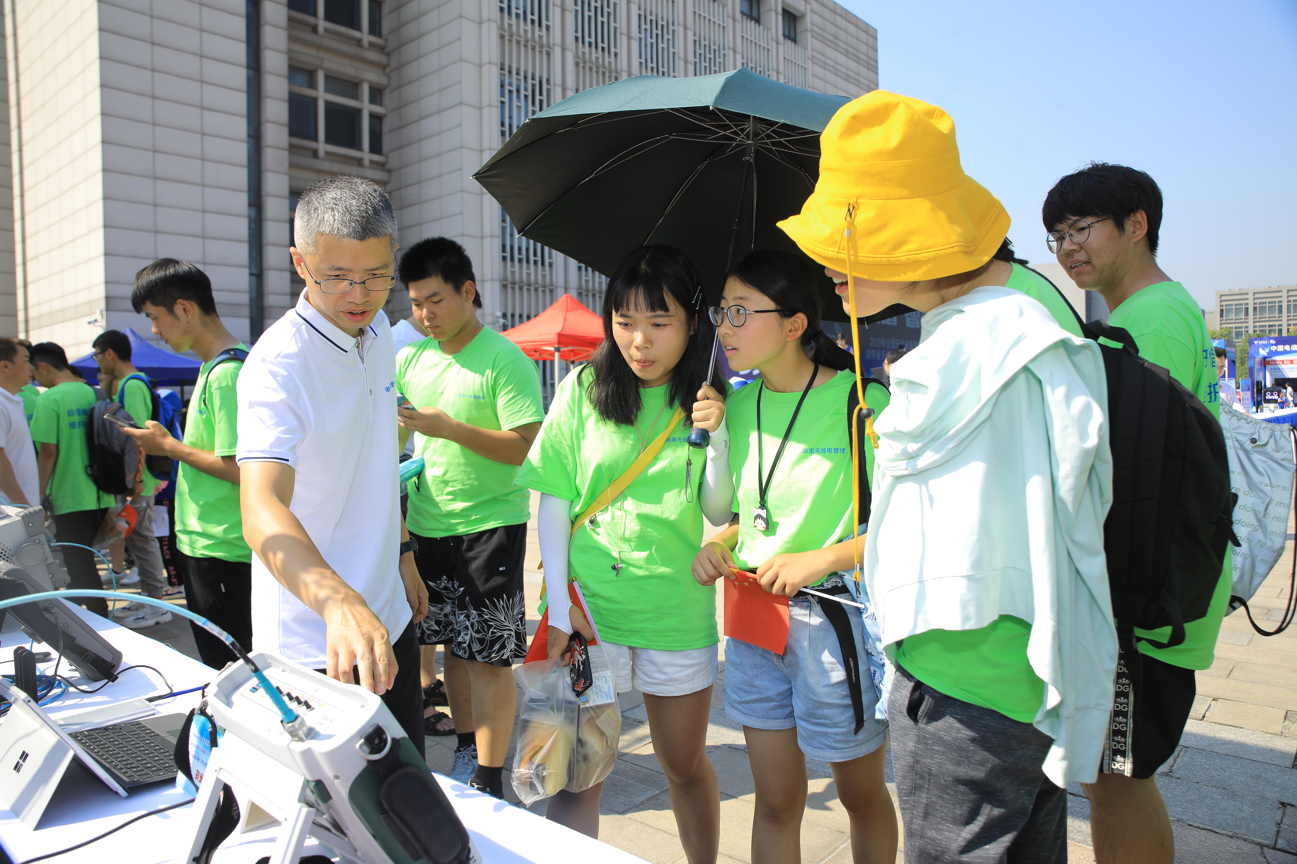 2019年湖南无线电科普宣传进校园活动上,工作人员向大学生们细心讲解无线电监测设备工作原理