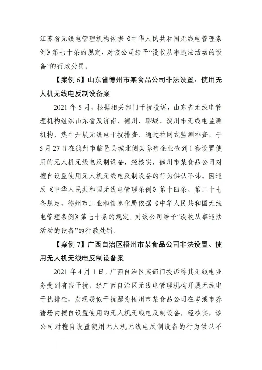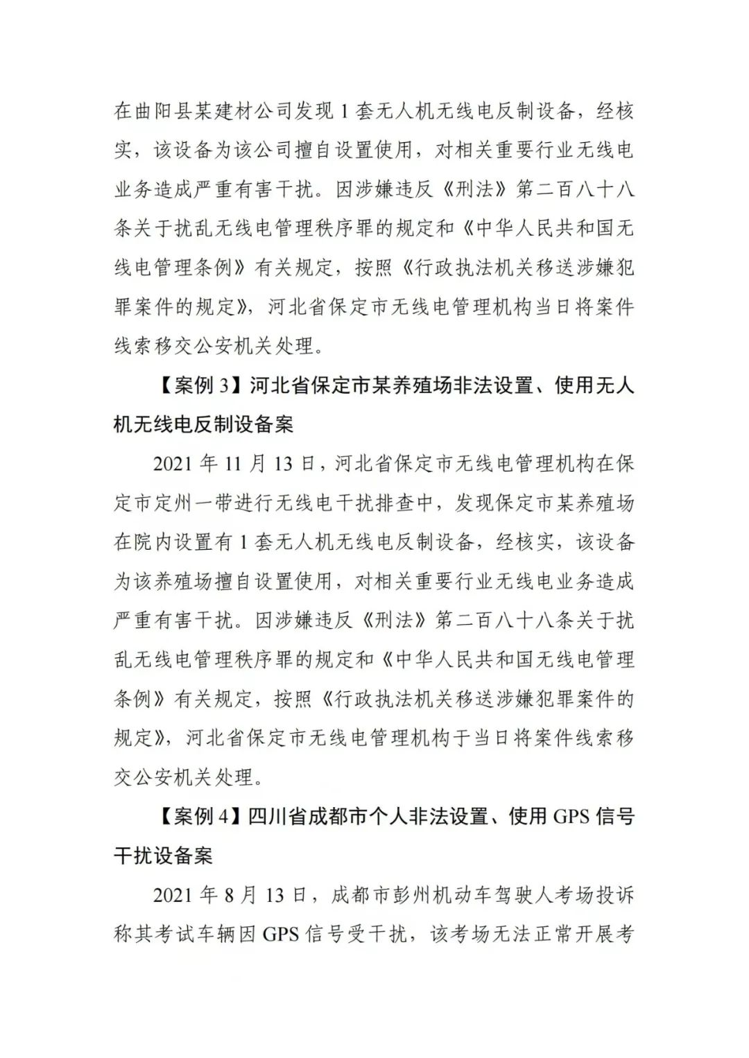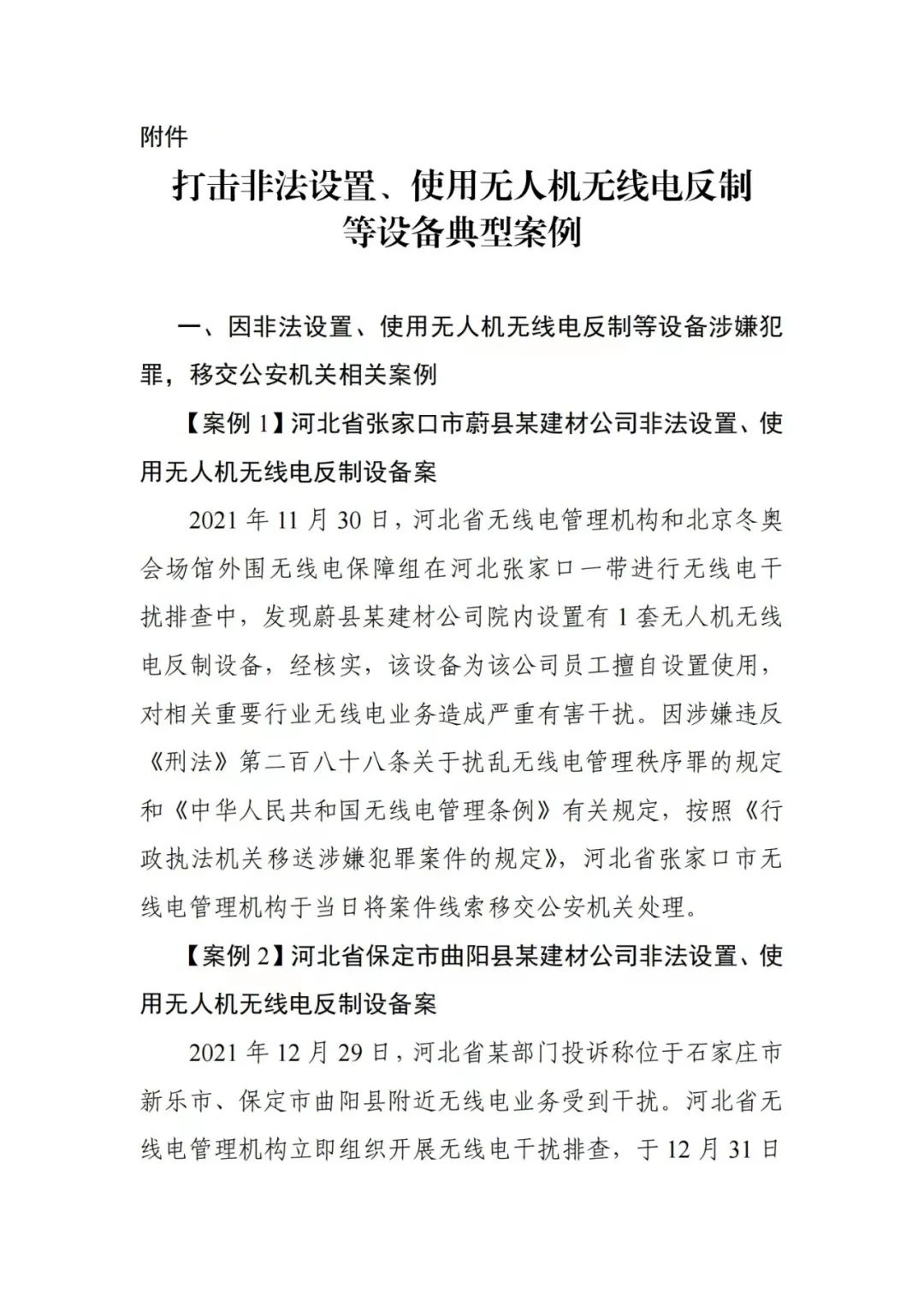 为保护国民经济重要行业无线电频率使用安全,近期,工业和信息化部会同公安部、司法部、国家市场监督管理总局等多部门联合开展严厉打击非法生产、销售和使用无人机无线电反制等设备执法行动。各地无线电管理机构会同有关部门,依据《中华人民共和国无线电管理条例》等法律法规,加大对相关违法行为的查处,截至目前,相关地方无线电管理机构已责令淘宝、京东、拼多多、苏宁易购等网购平台清理下架无人机无线电反制设备及信号干扰器、屏蔽器等未经型号核准的无线电发射设备8600余件;各地已通过向公安机关移送涉嫌犯罪案件、予以行政处罚、责令改正等方式查处非法设置使用相关设备案件110余起。