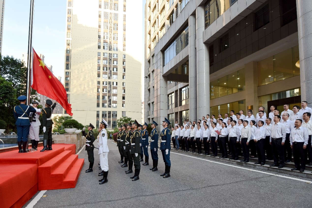 全体干部庄严肃立,奏唱国歌,向国旗行注目礼,表达对伟大祖国的深情祝福和崇高敬意