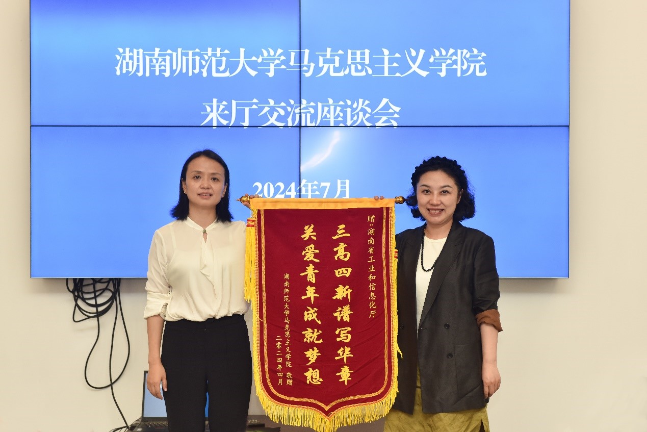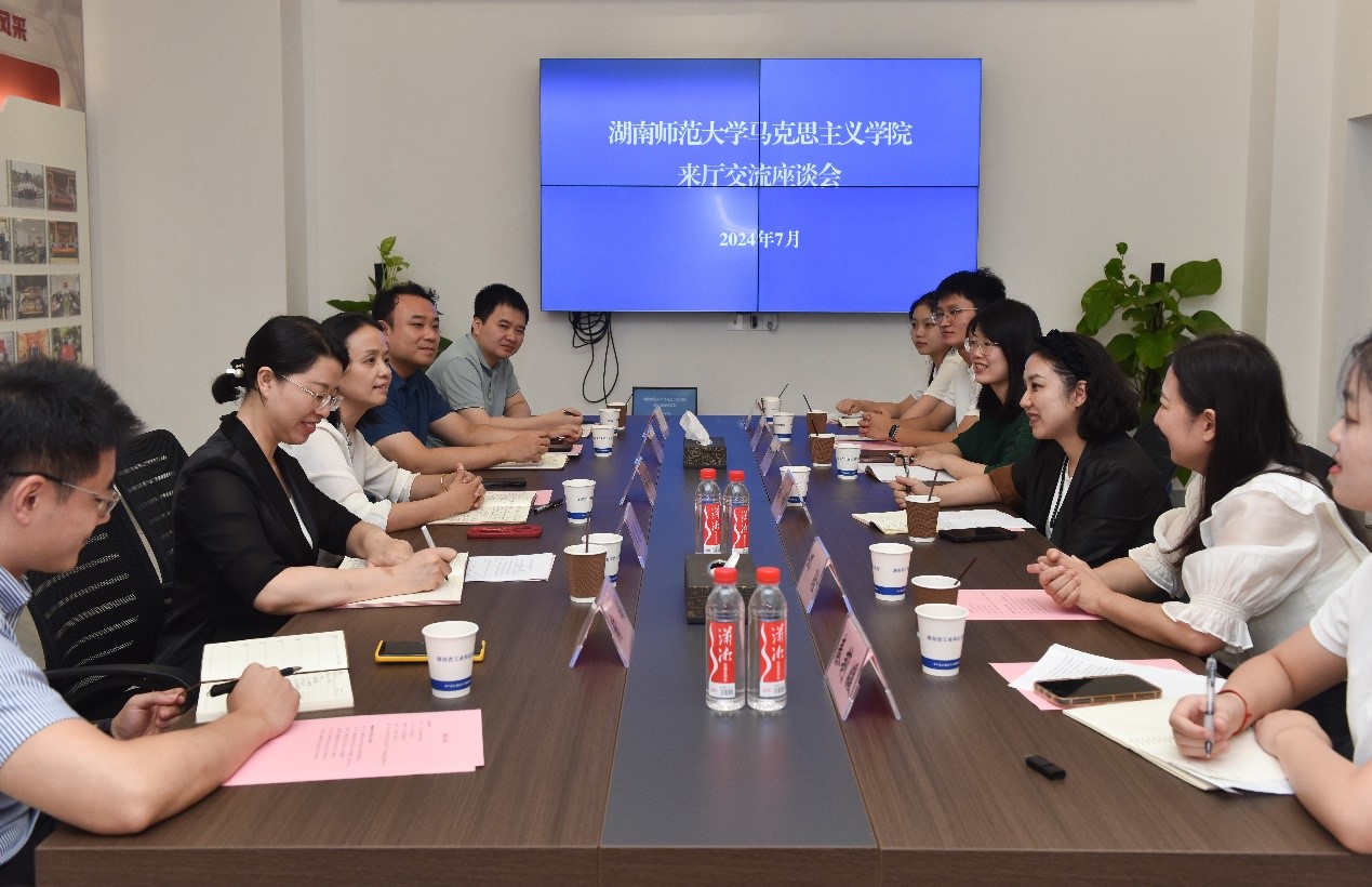 7月5日,湖南师范大学马克思主义学院党委副书记林峻一行来足球竞彩 交流座谈并赠送锦旗,机关党委、厅办公室、综合研究室、信息中心有关负责人,湖南师大马克思主义学院部分师生代表参加座谈。