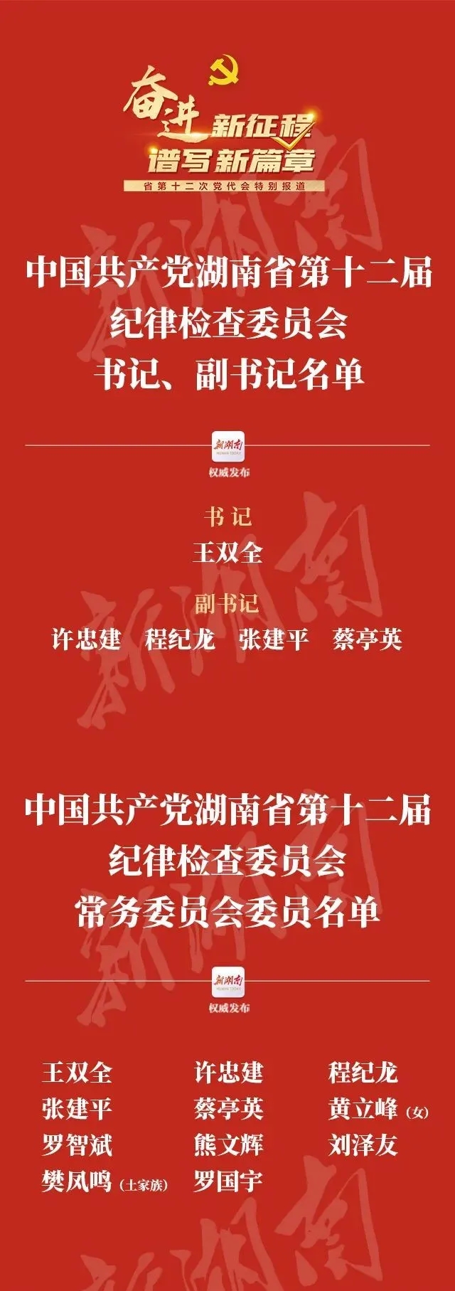 中国共产党湖南省第十二届纪律检查委员会书记、副书记、常委名单