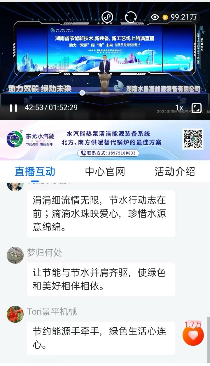 2024年12月5日,省工业通信业节能监察中心运用微赞直播平台成功举办主题为“助力双碳 绿动未来”的节能“新技术、新装备、新产品”线上路演直播活动。此次共遴选出6家“三新”技术产品企业参与,直播时长113分钟,在线观看人次达99.2万,观看峰值人数达9.64万,直播过程反响热烈,互动频繁。