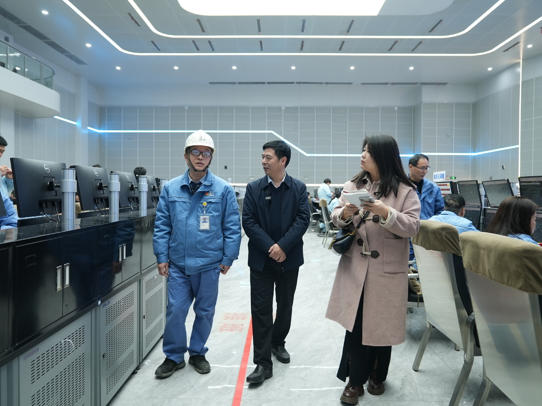 (在湖南石化己内酰胺产业链搬迁与升级转型发展项目中控室,记者和专家、项目负责人一同调研。湖南日报全媒体记者 邹尚奇 摄)